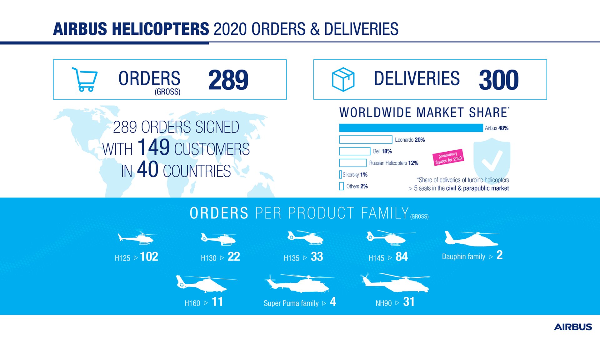 En 2020, Airbus Helicopters registró 289 pedidos brutos (netos: 268) en un mercado desafiante fuertemente afectado por las consecuencias económicas de la pandemia de COVID-19, lo que refuerza la posición de la compañía en el mercado civil y parapúblico. Además, la compañía entregó 300 helicópteros en todo el mundo a pesar de las restricciones de viaje pandémicas, lo que resultó en una participación estable del 48% del mercado civil y parapúblico y, por lo tanto, permitió a Airbus Helicopters mantener su posición de liderazgo en el mercado gracias a su amplia gama de productos competitivos diseñados para permitir clientes para realizar multitud de misiones.